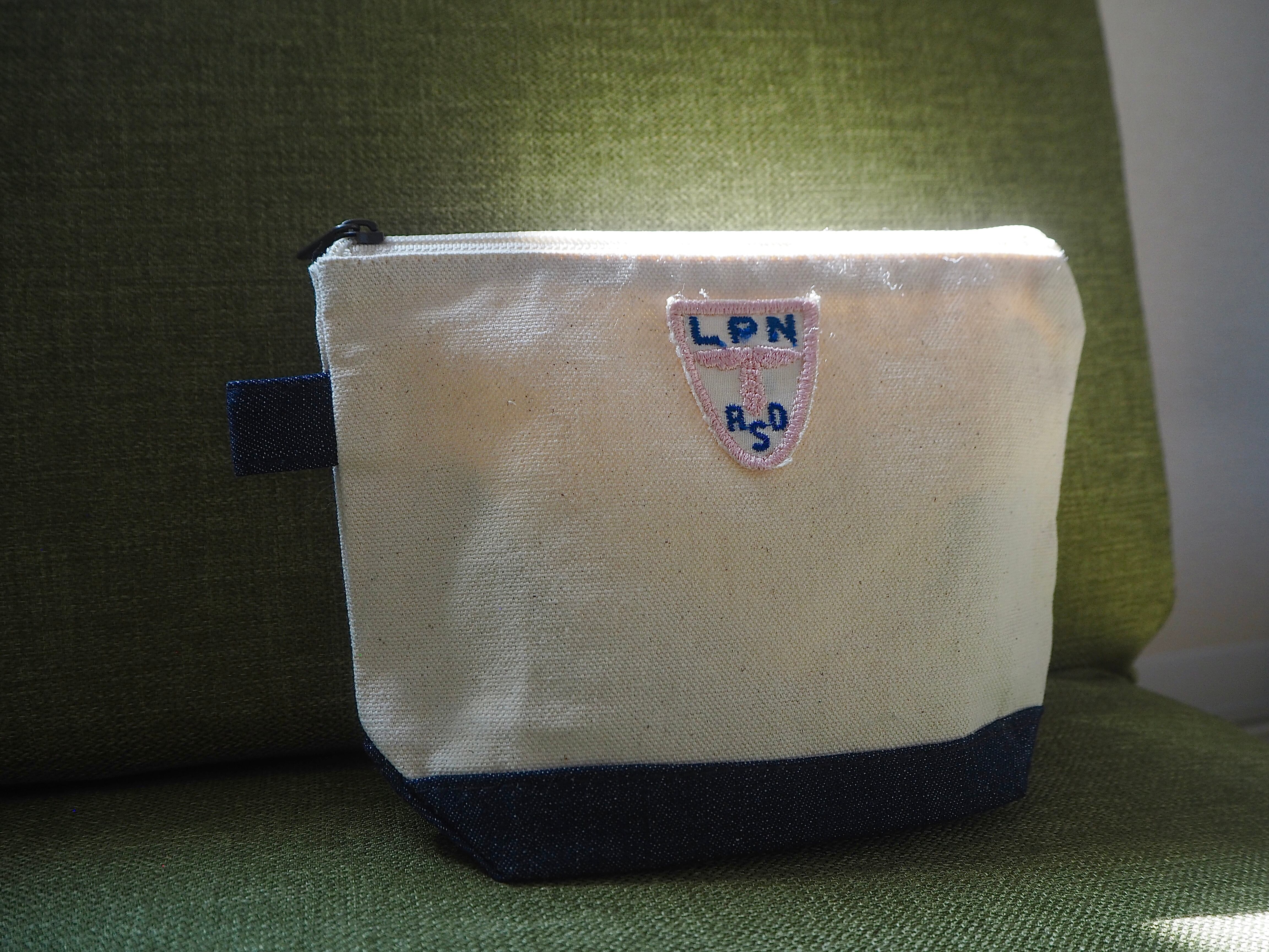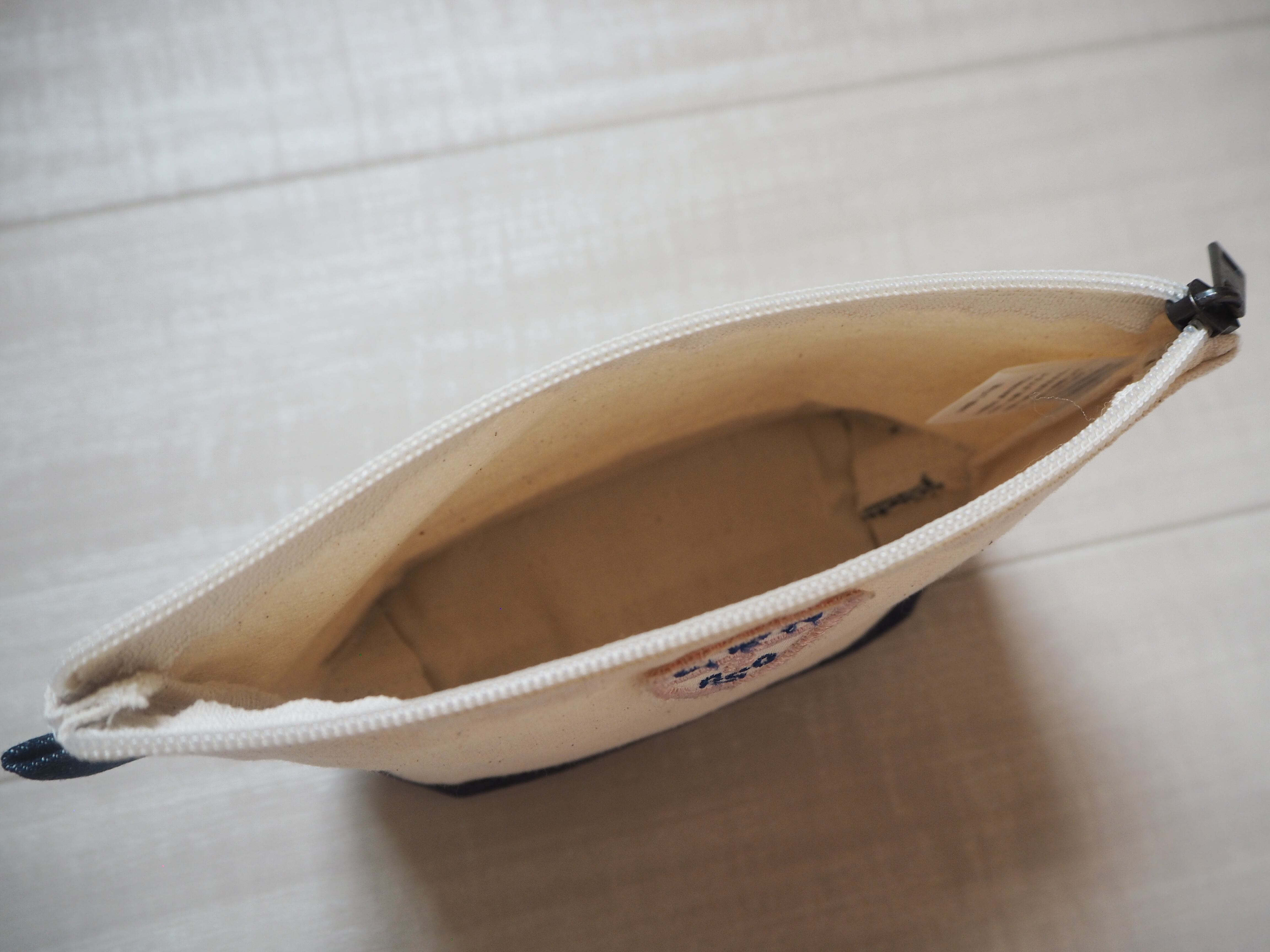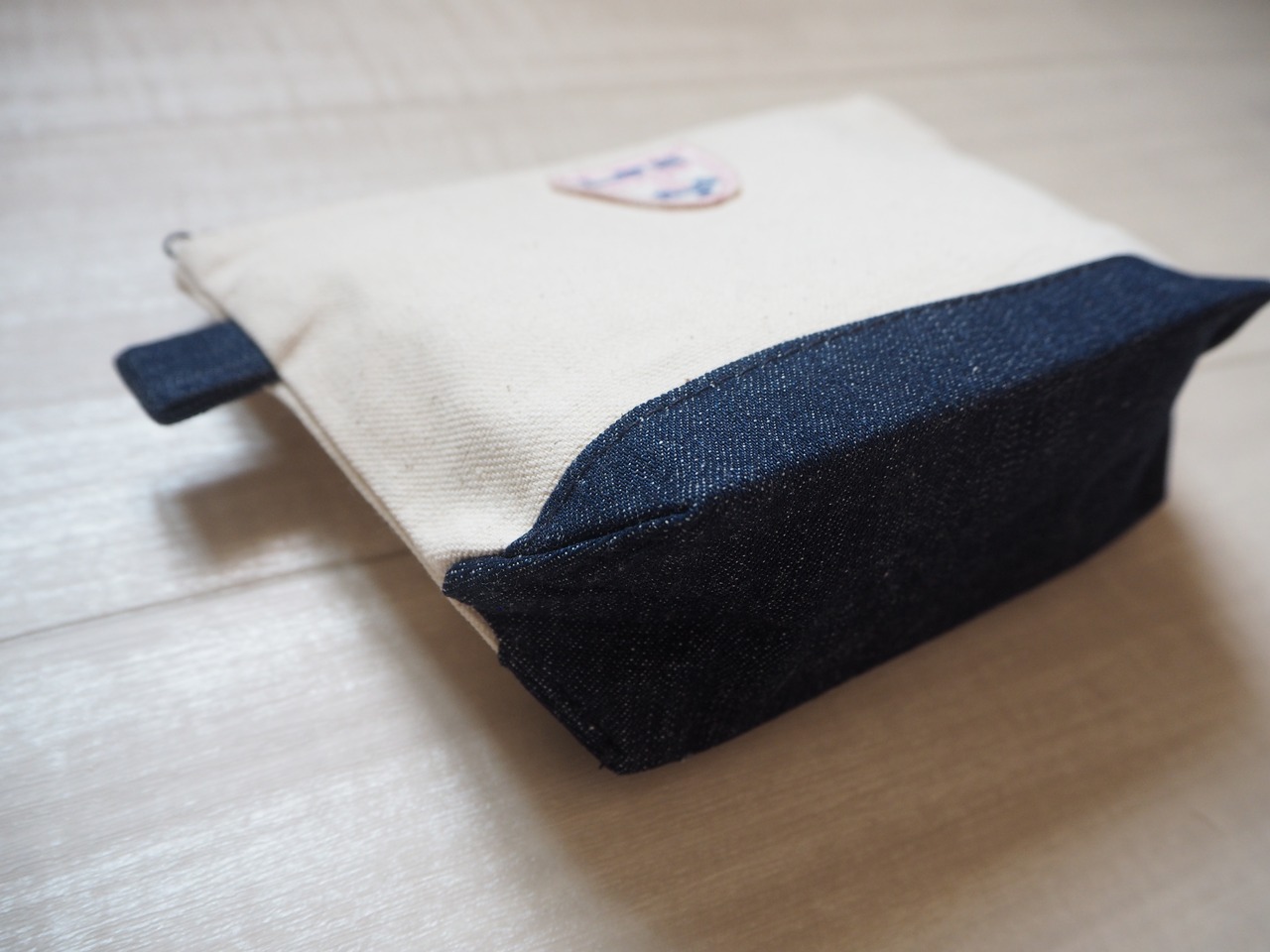 柔らかなキャンバス素材とデニム生地を使用したツートンカラー*マチが広めで様々なシーンで活躍しそうなワッペン付バイカラーデイリーポーチ◎